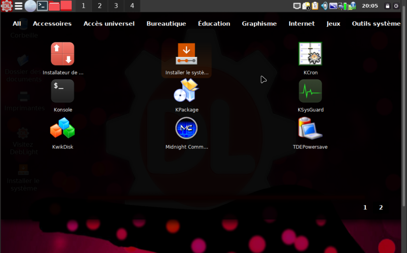 - Soit en cliquant sur les 3 traits pour faire apparaître le menu DebLight (les icônes sur fond noir), ensuite "Outils Système" puis (page 2) "Installer le système".