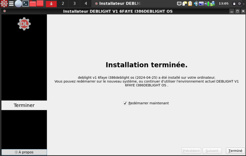 Une fois que le processus d'installation est terminé, on vous propose de redémarrer. On clic sur "Terminé" pour redémarrer sur DebLight OS installé. Sauf si vous souhaitez poursuivre avec la session en Live CD (DVD) ou clé USB.
