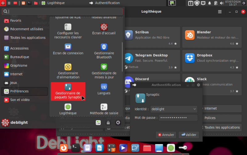 Menu démarrer, la logithèque, Connexion à Synaptic (logiciels) |